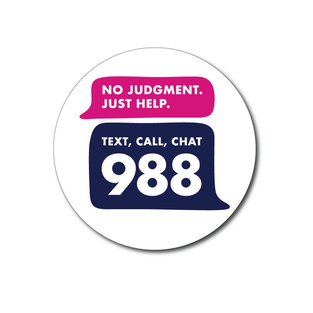 Measuring 5.5" x 5.5", this round vinyl sticker features bold messaging in vibrant speech bubble graphics: “No Judgment. Just Help.” and the easy-to-remember 988 hotline for text, call, or chat.